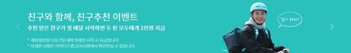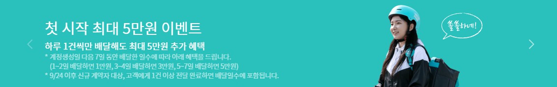 일종의 초보자 이벤트 같은 건데 제가 신청했을 때 했던 프로모션은 아이디 발급 다음날부터 3일간, 하루 한건이라도 배달을 하면 +1만원을 주는 이벤트였습니다. 그러니까 그 3일 동안은 3만원을 더 받을 수 있는 거죠. 개꿀이죠? 그런데 위에 적어 놓은 준비물이 준비되지 않은 상태에서 아이디가 먼저 발급되면 그 꿀을 핥을 수 있는 날이 줄어들기 때문입니다.